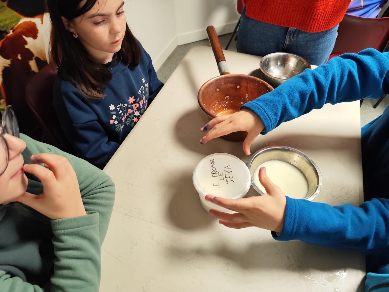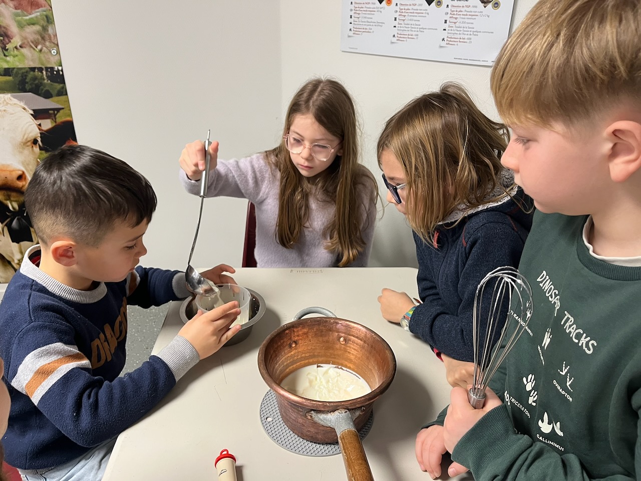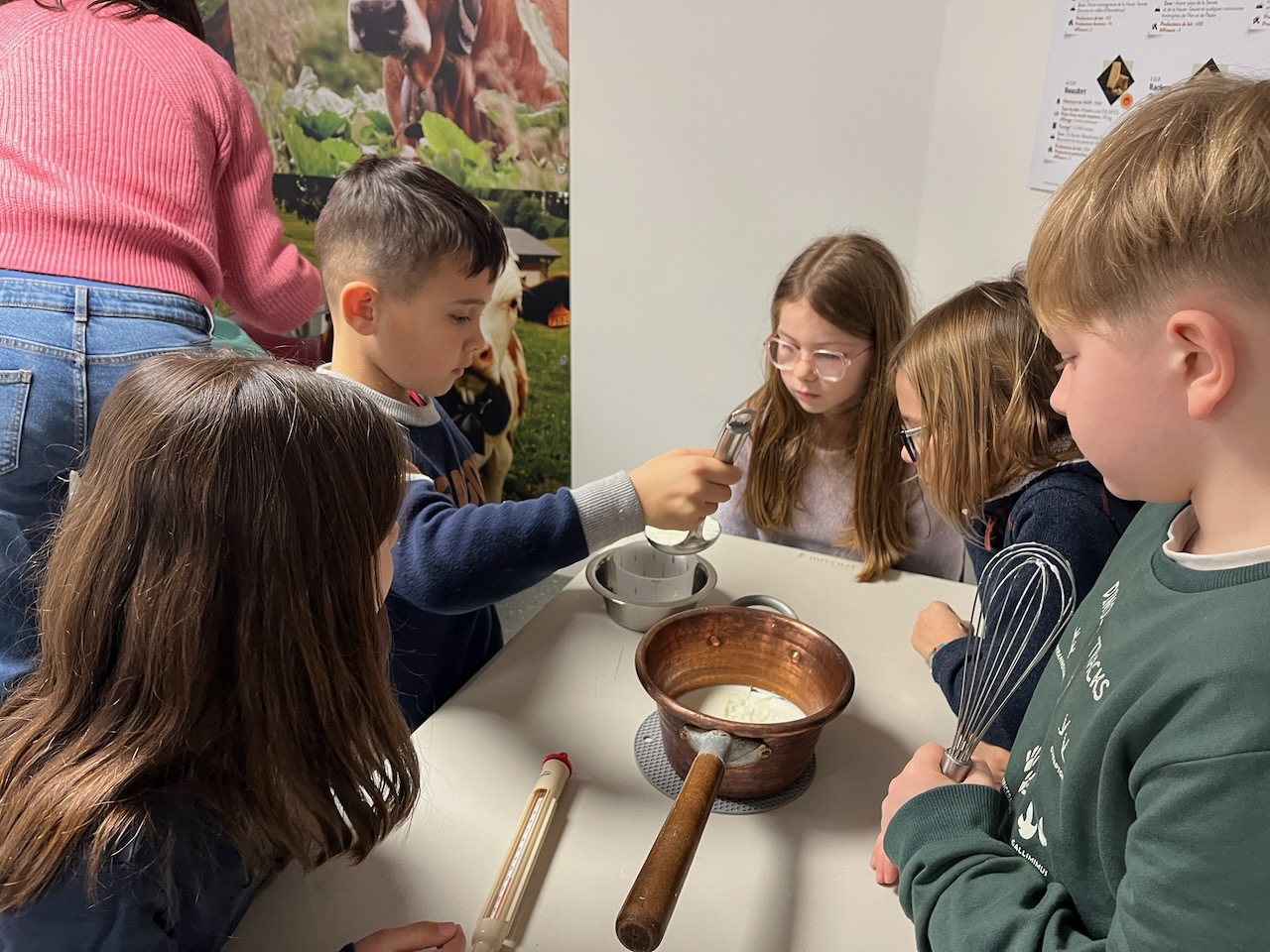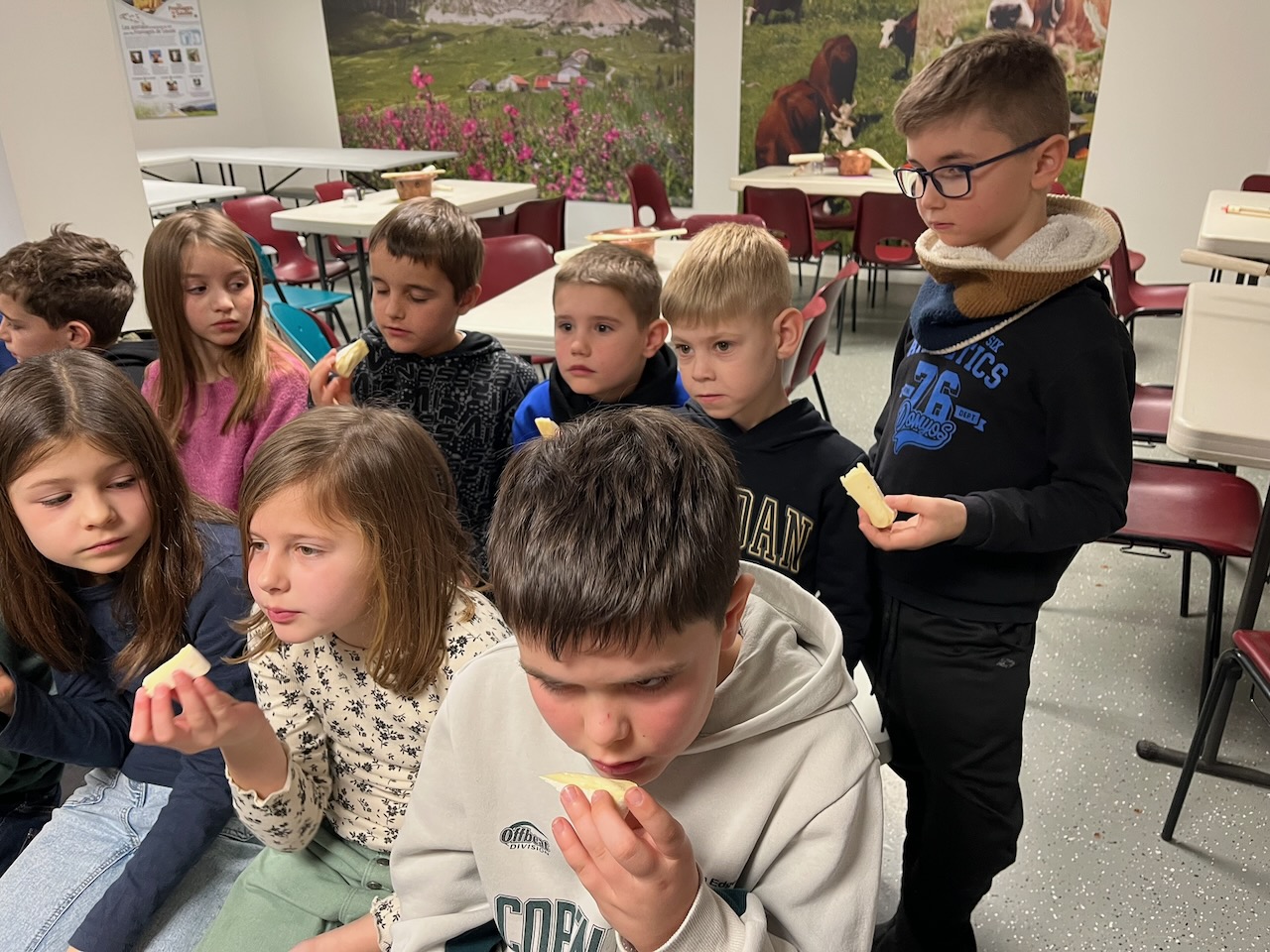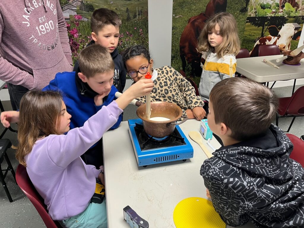Les enfants ont découvert le chemin du lait, de la vache jusqu’au fromage. Grâce à des explications adaptées à leur âge, ils ont appris d’où vient le lait, comment il est transformé et quels sont les métiers liés à la fabrication du fromage.