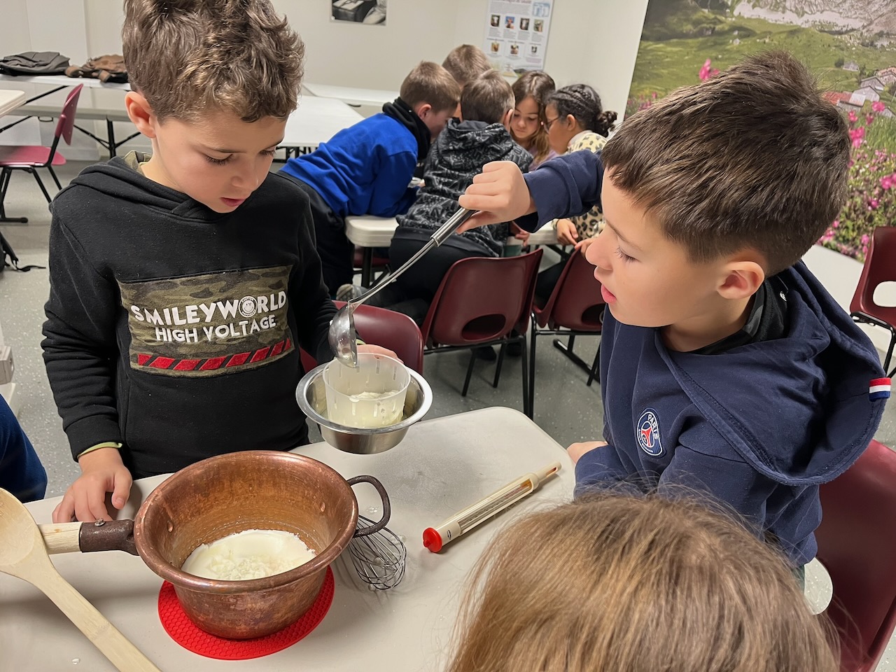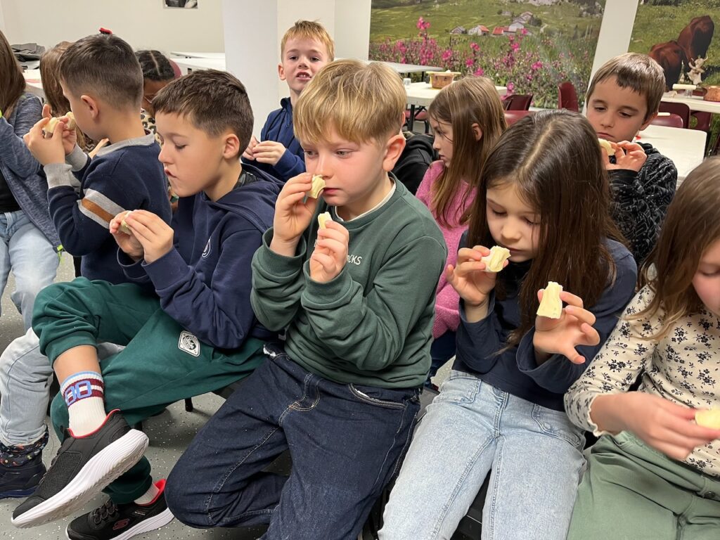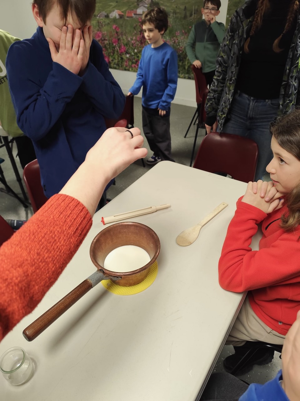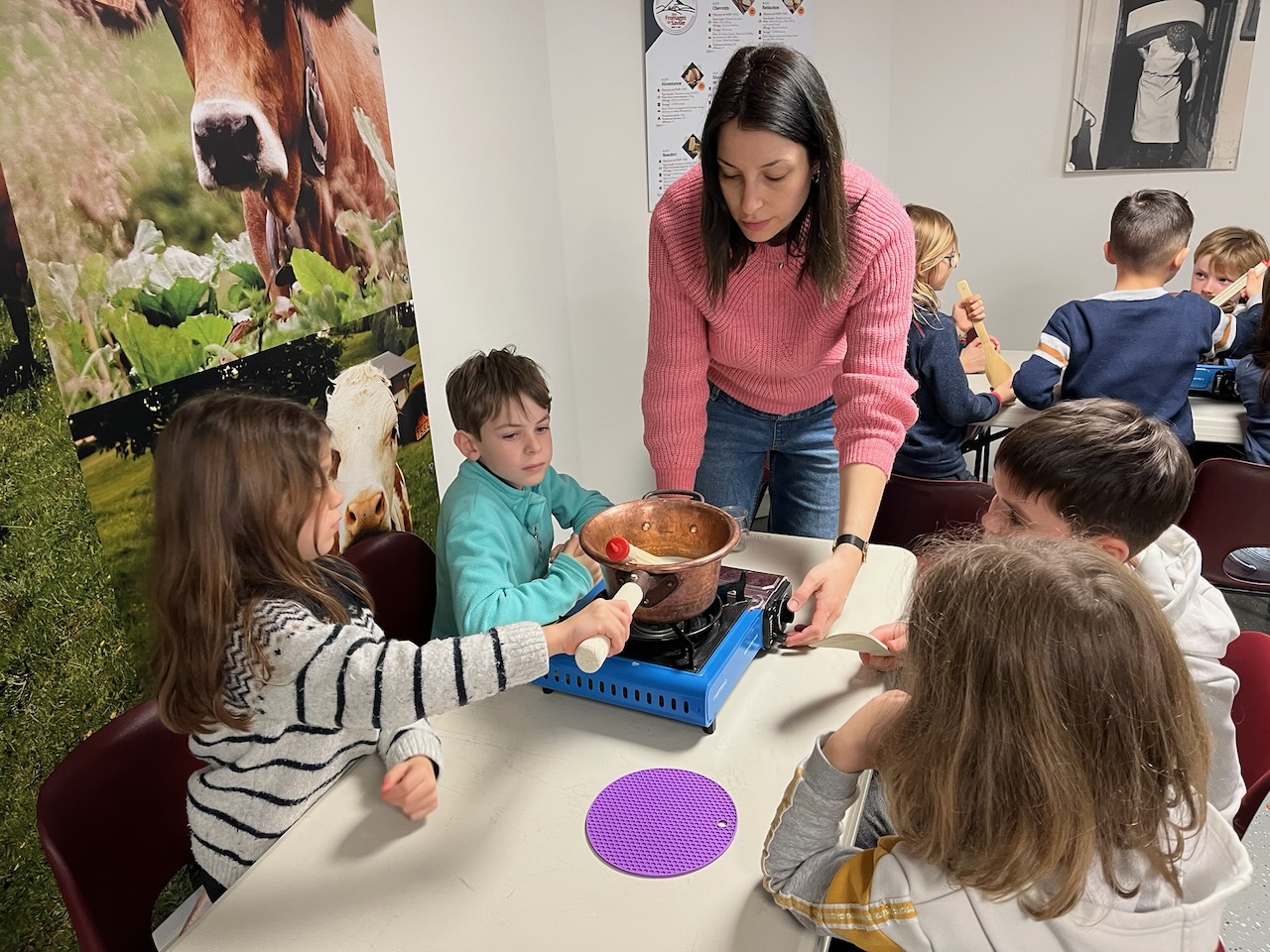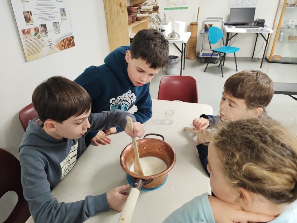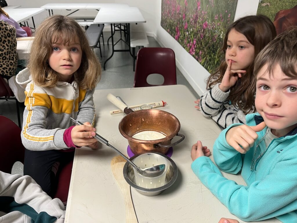 Les enfants ont découvert le chemin du lait, de la vache jusqu’au fromage. Grâce à des explications adaptées à leur âge, ils ont appris d’où vient le lait, comment il est transformé et quels sont les métiers liés à la fabrication du fromage.