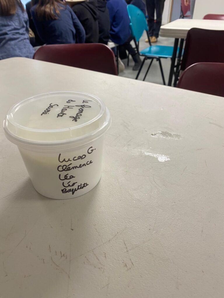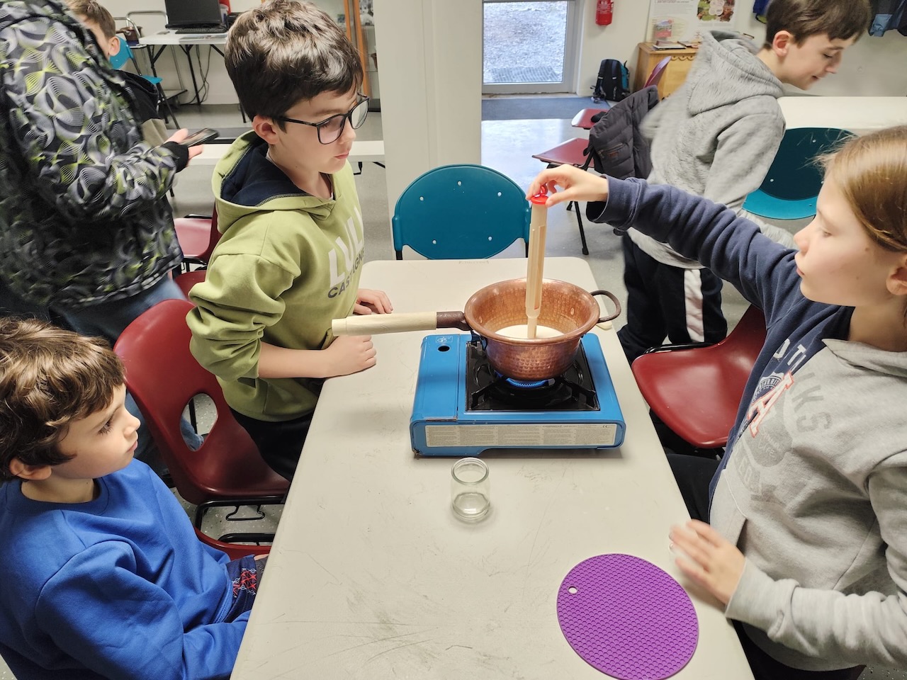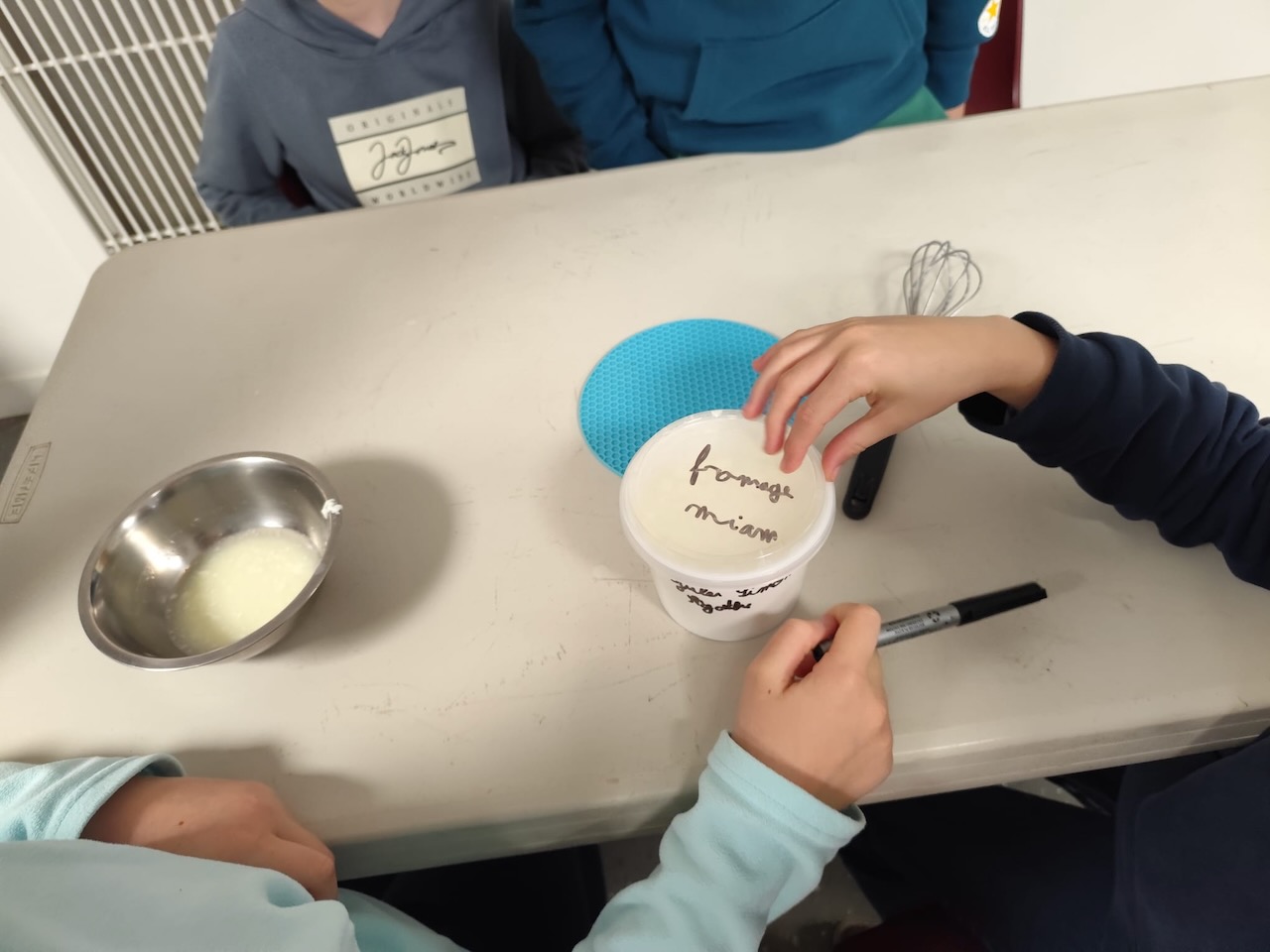 Puis place à la pratique ! Les élèves ont participé pas à pas à la fabrication d’une tomme blanche : observation du lait, ajout de la présure, mélange, séparation du petit-lait et du caillé… Chacun a pu manipuler, sentir, observer.
