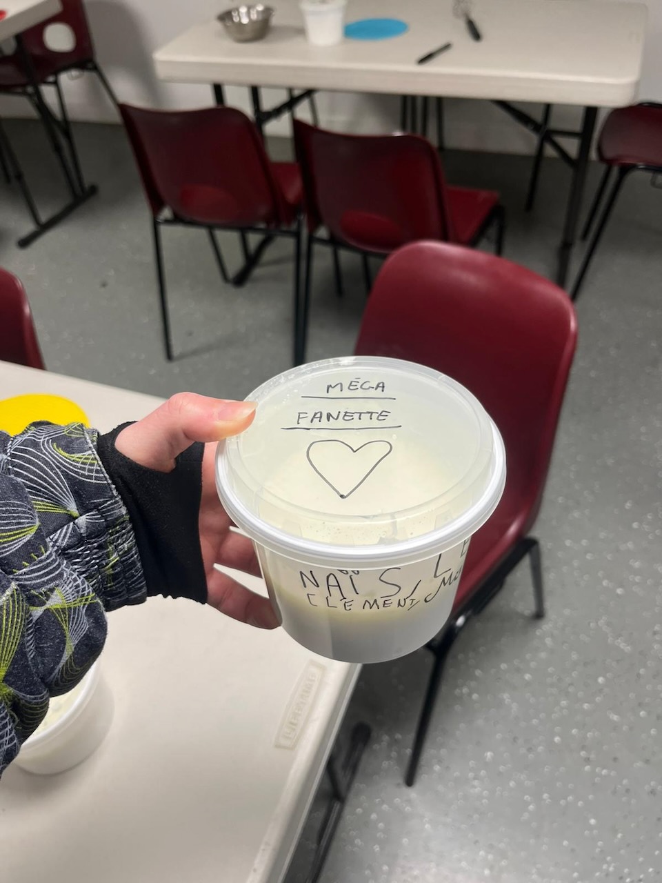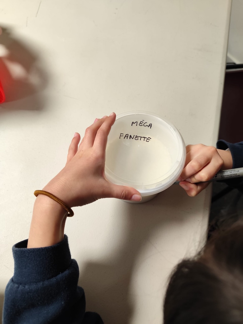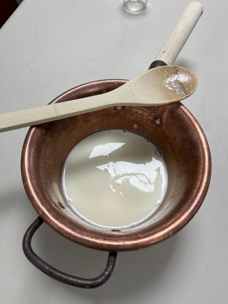 Puis place à la pratique ! Les élèves ont participé pas à pas à la fabrication d’une tomme blanche : observation du lait, ajout de la présure, mélange, séparation du petit-lait et du caillé… Chacun a pu manipuler, sentir, observer.