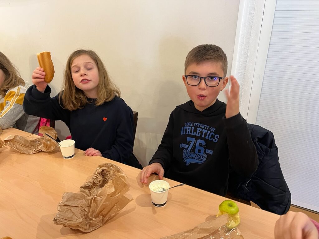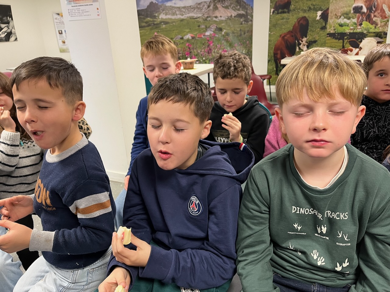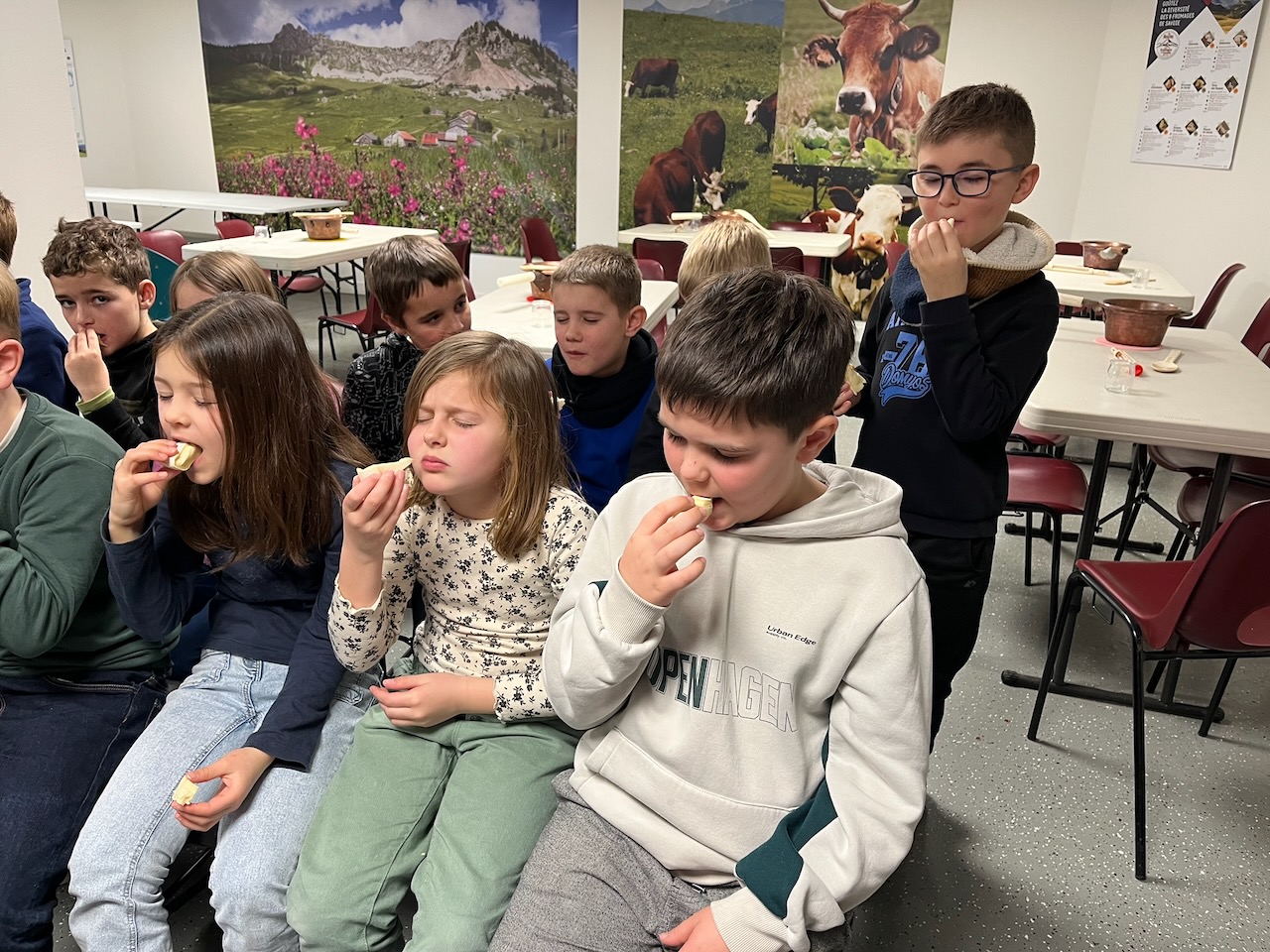 Les élèves ont pu ensuite goûter un morceau d’Abondance. Les deux groupes ont dégusté leur tomme blanche avec un peu de sucre.