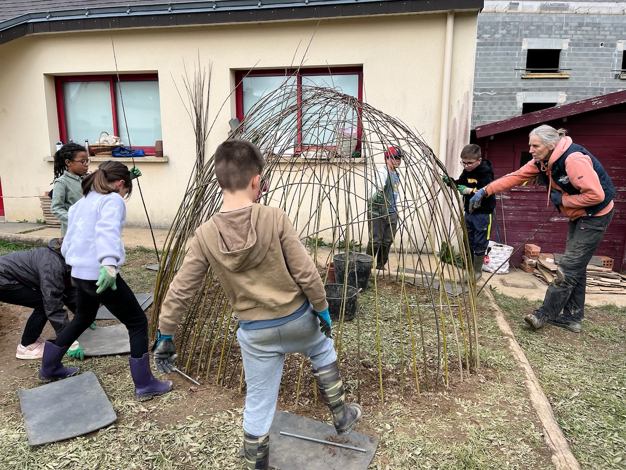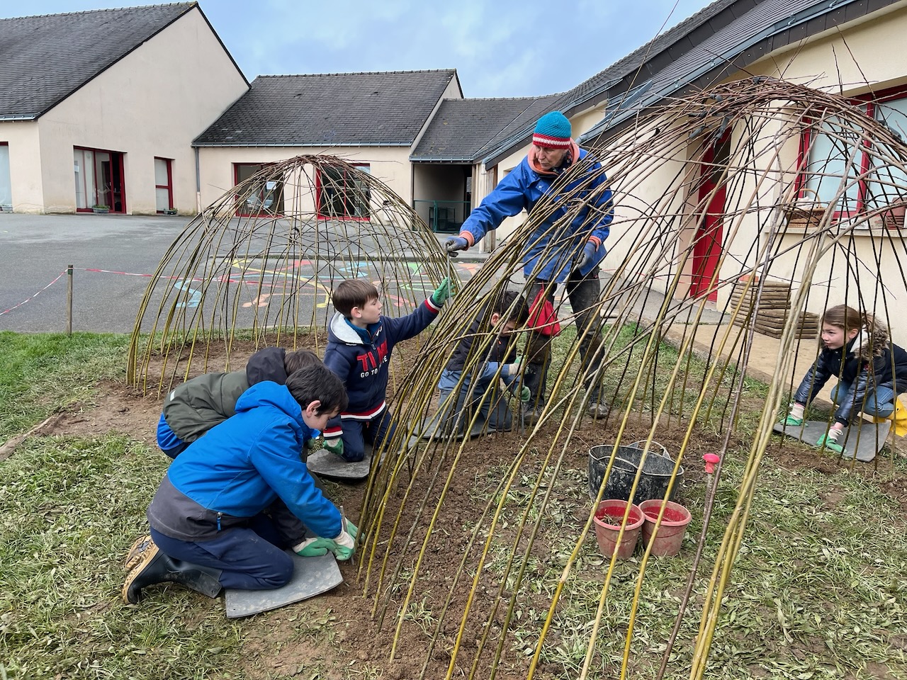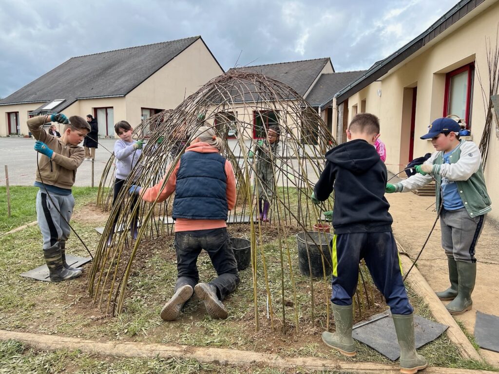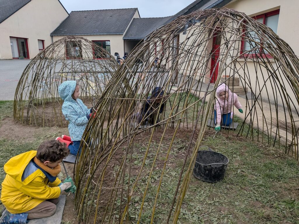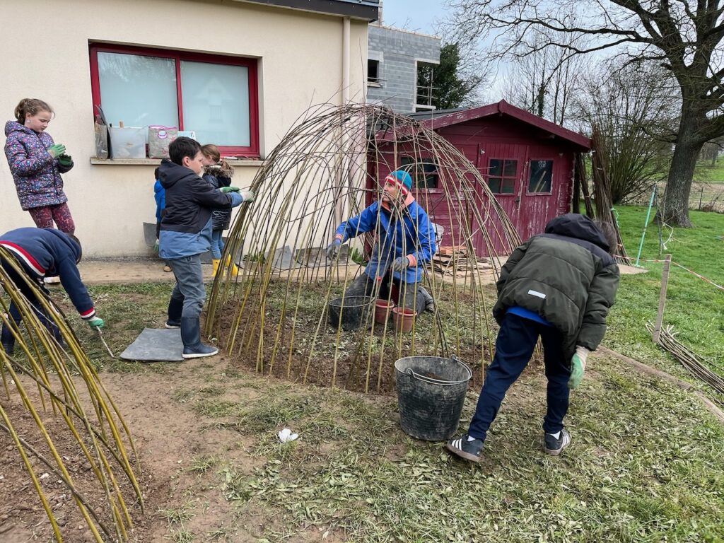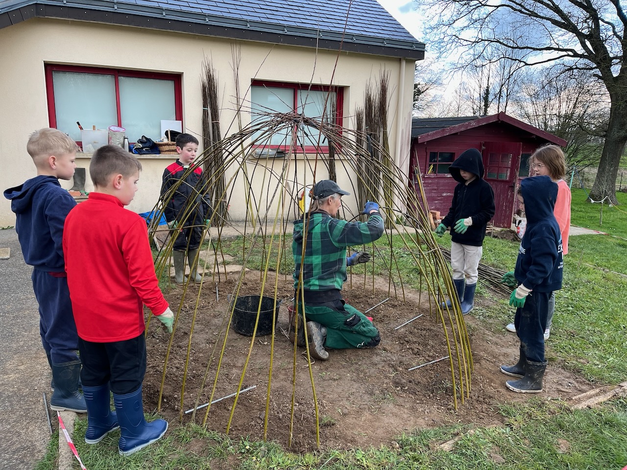 Ce projet a mobilisé les quatre classes de l’école autour d’un objectif commun : créer ensemble un espace naturel, durable et évolutif, au cœur de la cour de récréation. Encadrés par Caroline Chomy, les élèves ont découvert une technique particulière consistant à tresser des brins d’osier encore vivants. Au fil des jours, ils ont ainsi donné forme à deux véritables cabanes végétales.