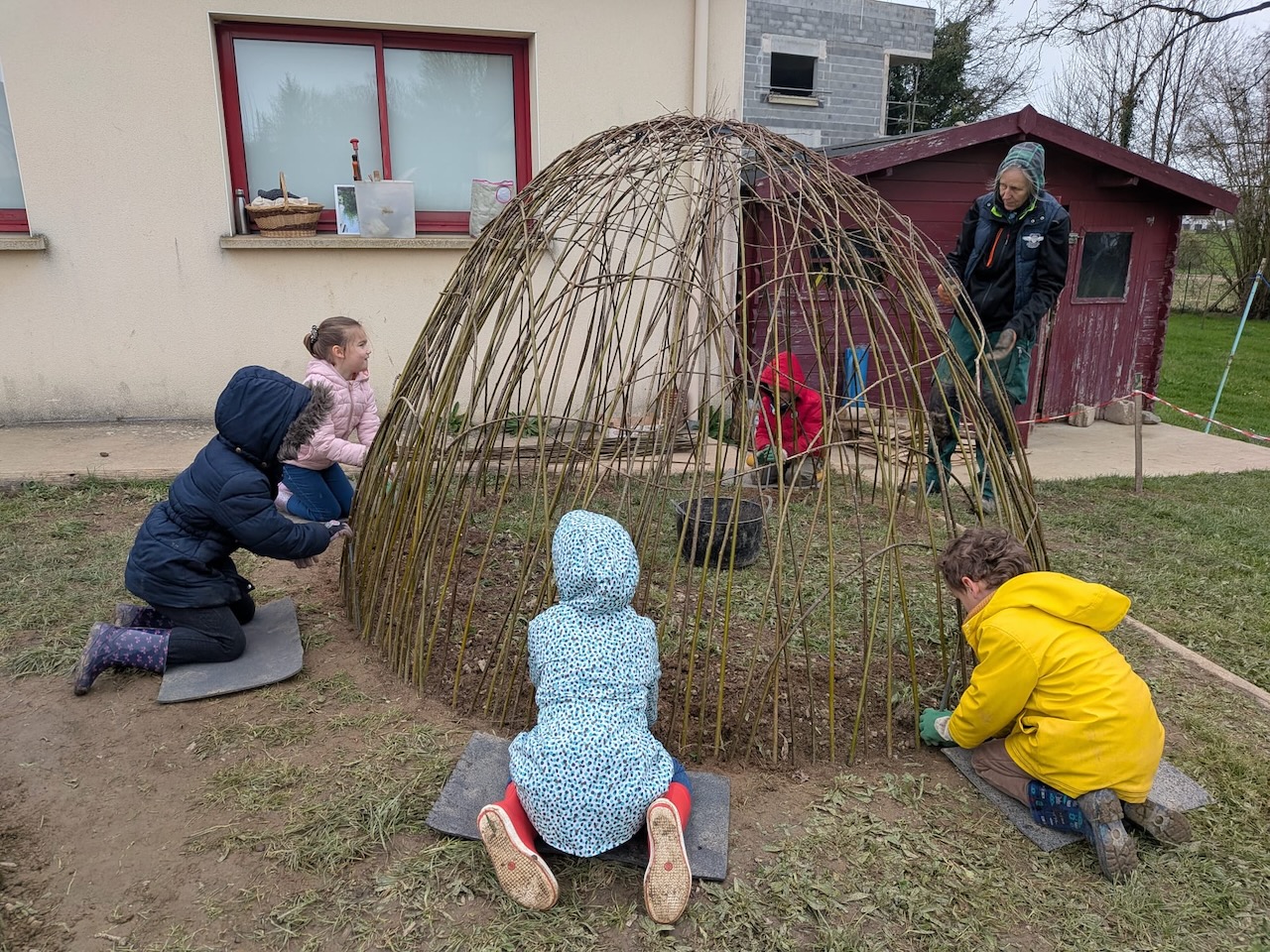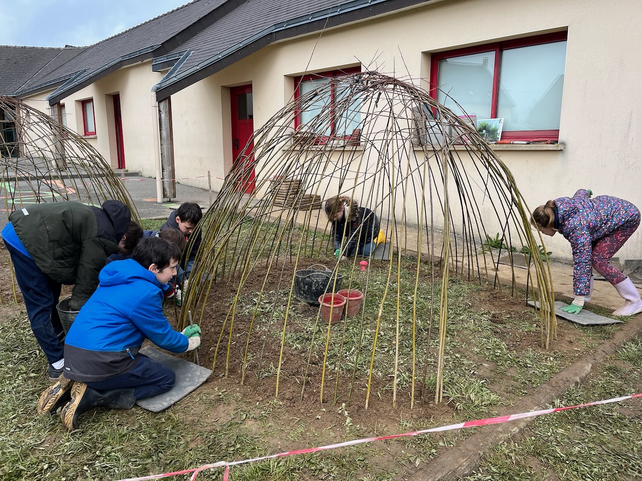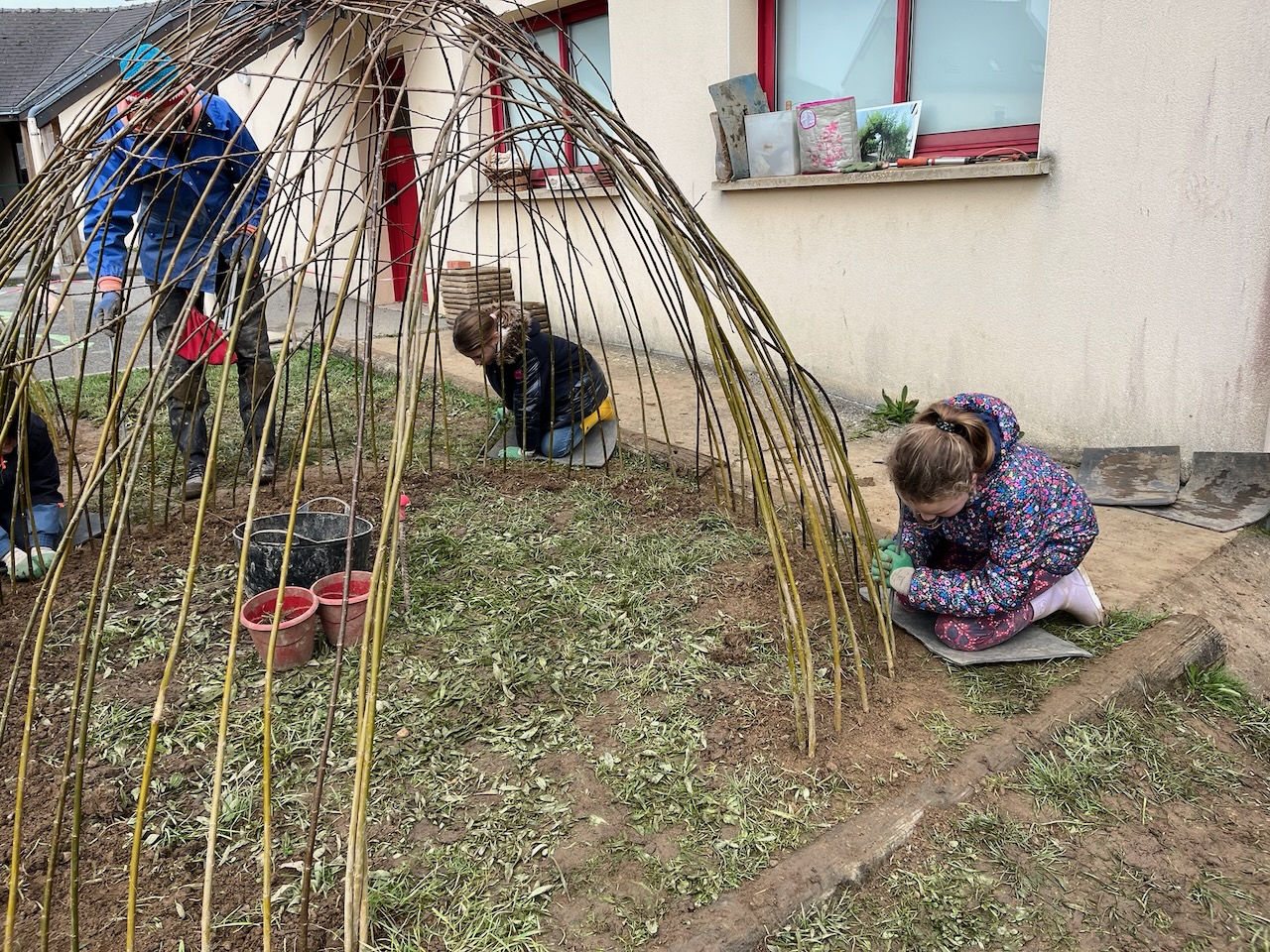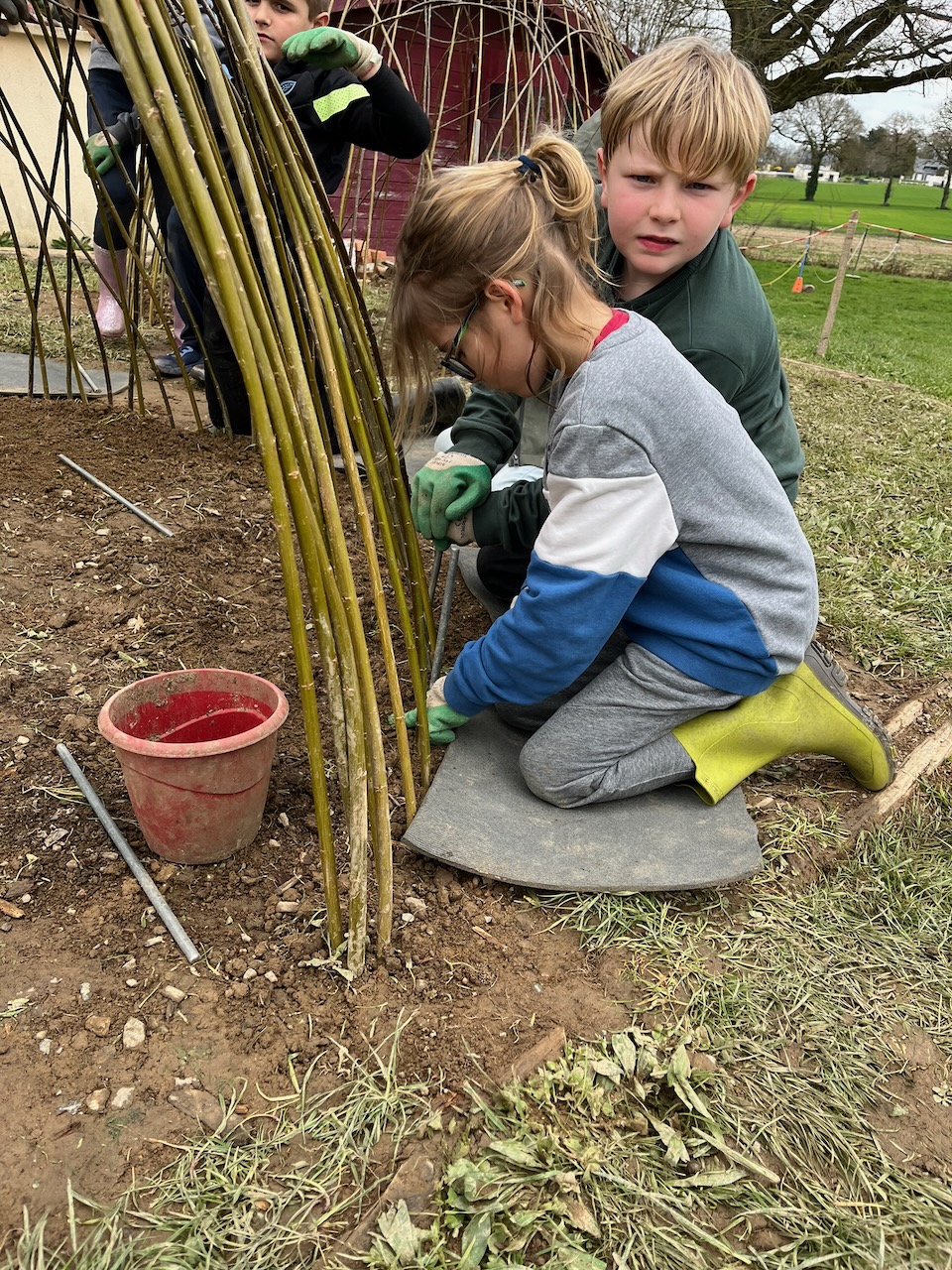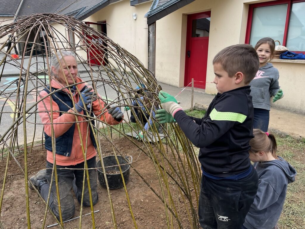 Ce projet a mobilisé les quatre classes de l’école autour d’un objectif commun : créer ensemble un espace naturel, durable et évolutif, au cœur de la cour de récréation. Encadrés par Caroline Chomy, les élèves ont découvert une technique particulière consistant à tresser des brins d’osier encore vivants. Au fil des jours, ils ont ainsi donné forme à deux véritables cabanes végétales.