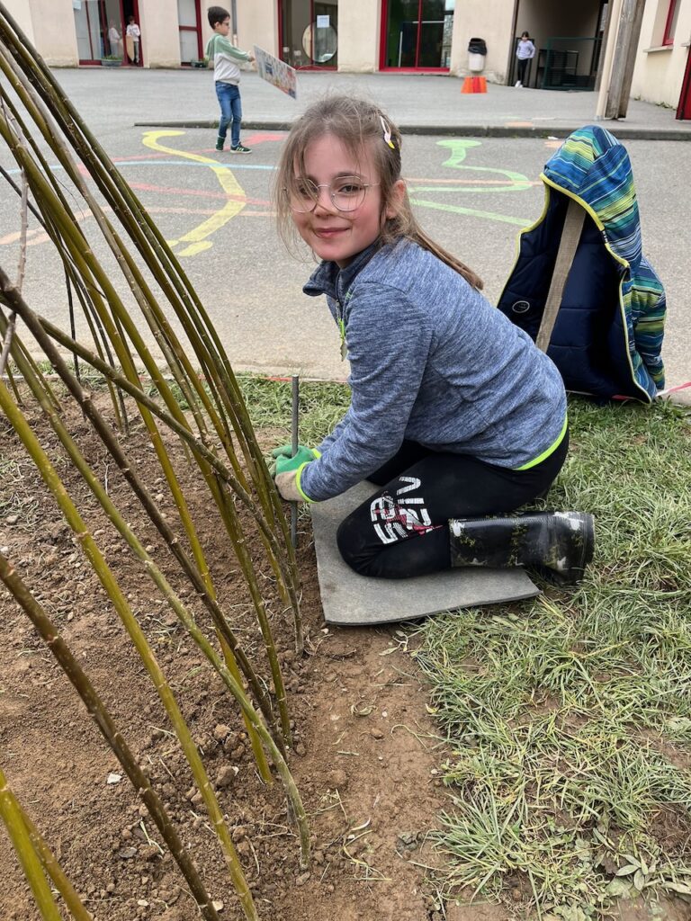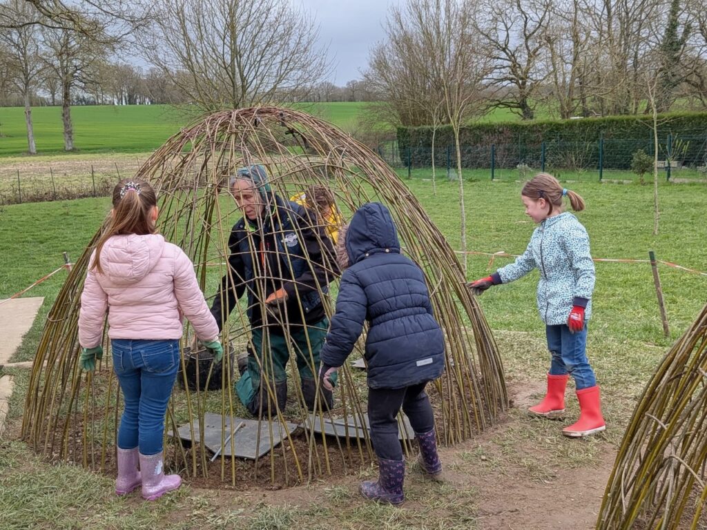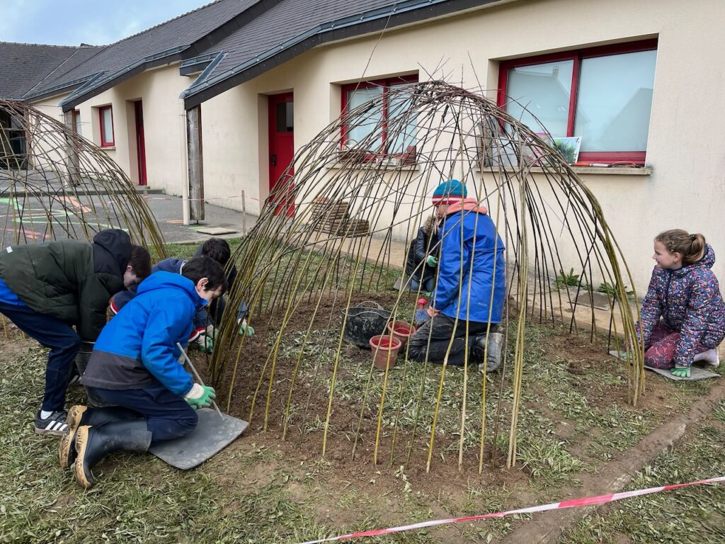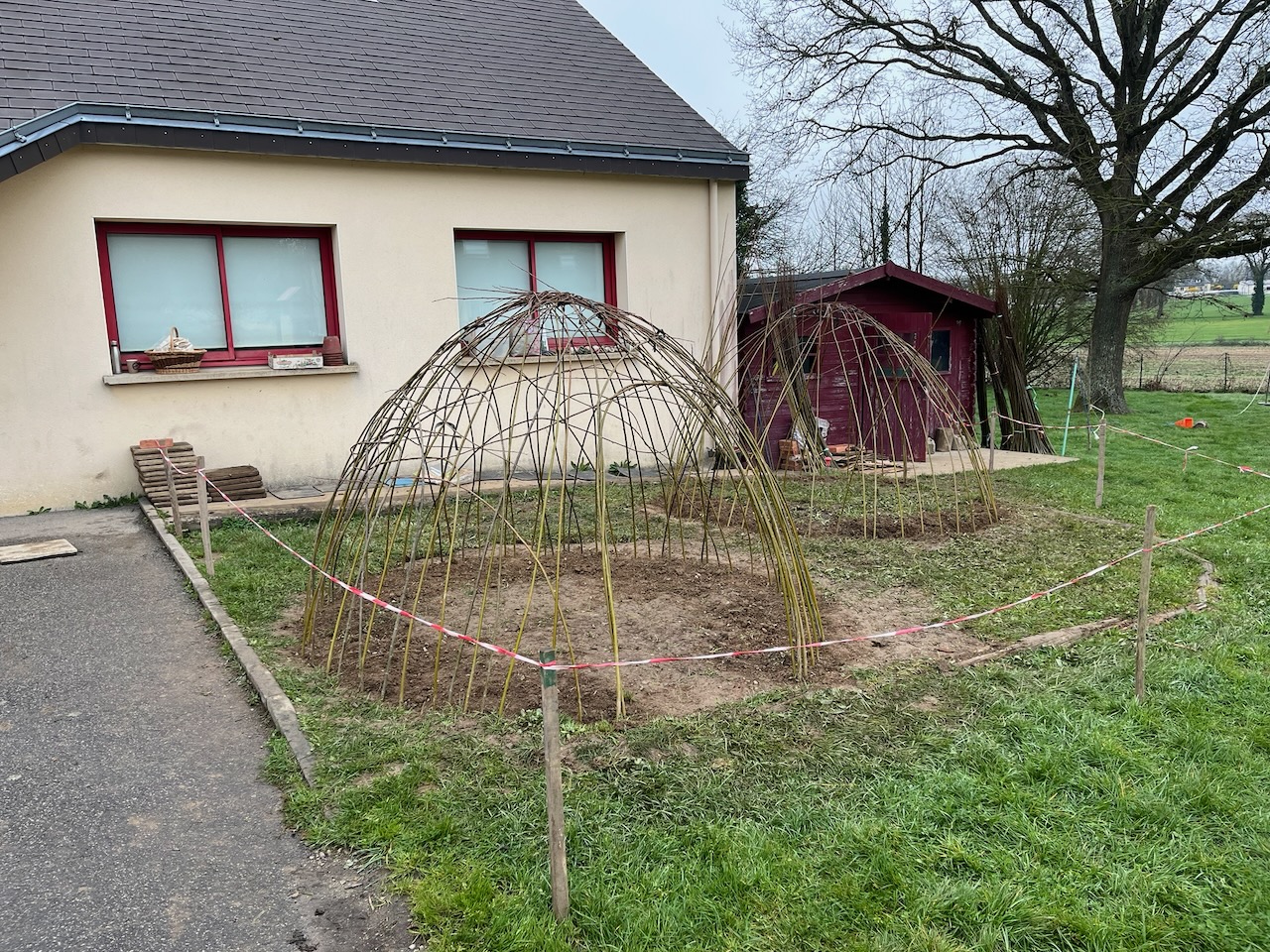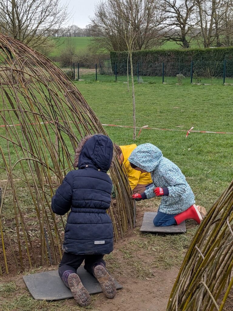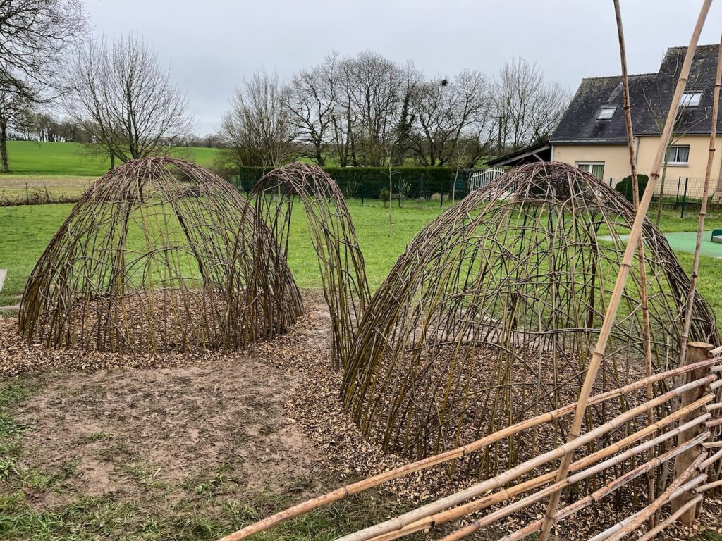 Ce projet a mobilisé les quatre classes de l’école autour d’un objectif commun : créer ensemble un espace naturel, durable et évolutif, au cœur de la cour de récréation. Encadrés par Caroline Chomy, les élèves ont découvert une technique particulière consistant à tresser des brins d’osier encore vivants. Au fil des jours, ils ont ainsi donné forme à deux véritables cabanes végétales.