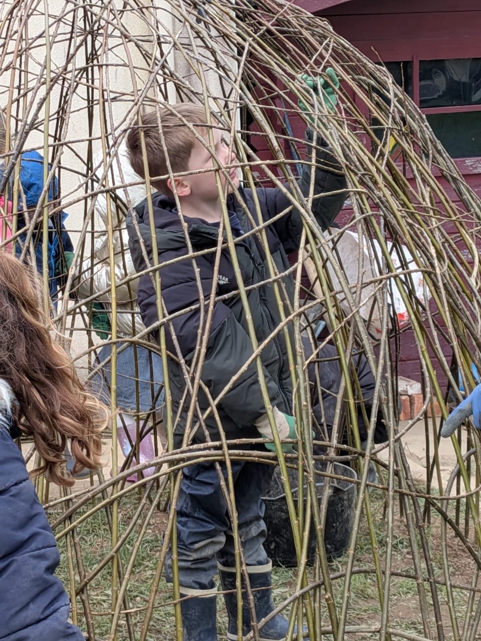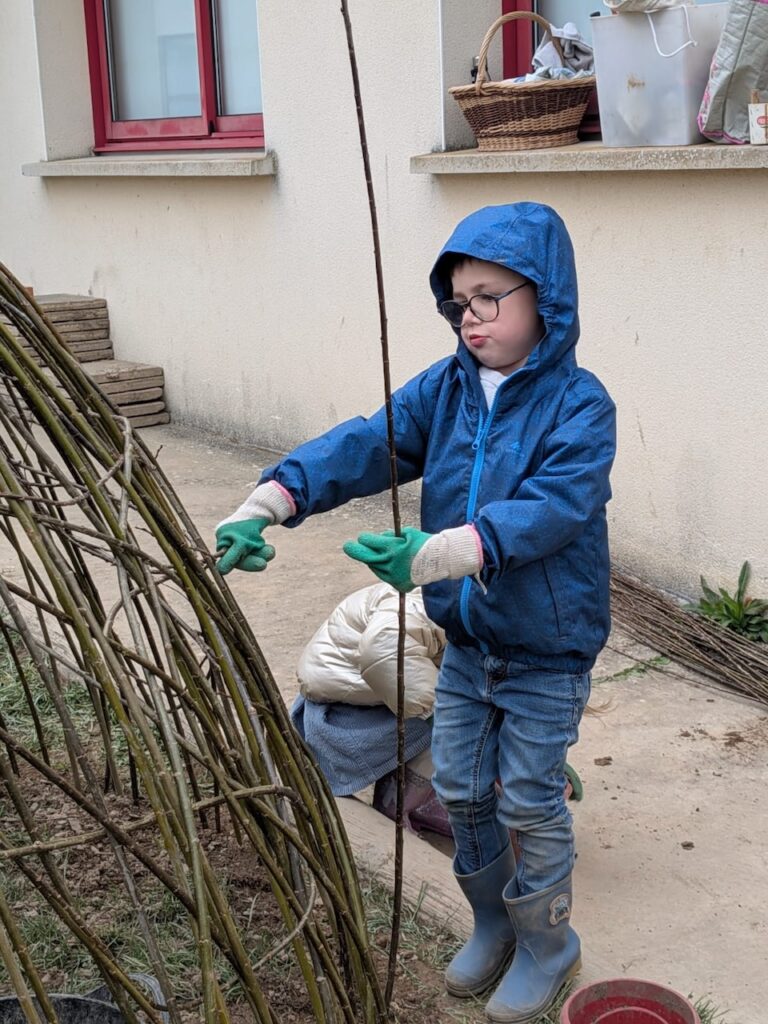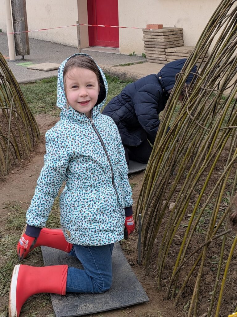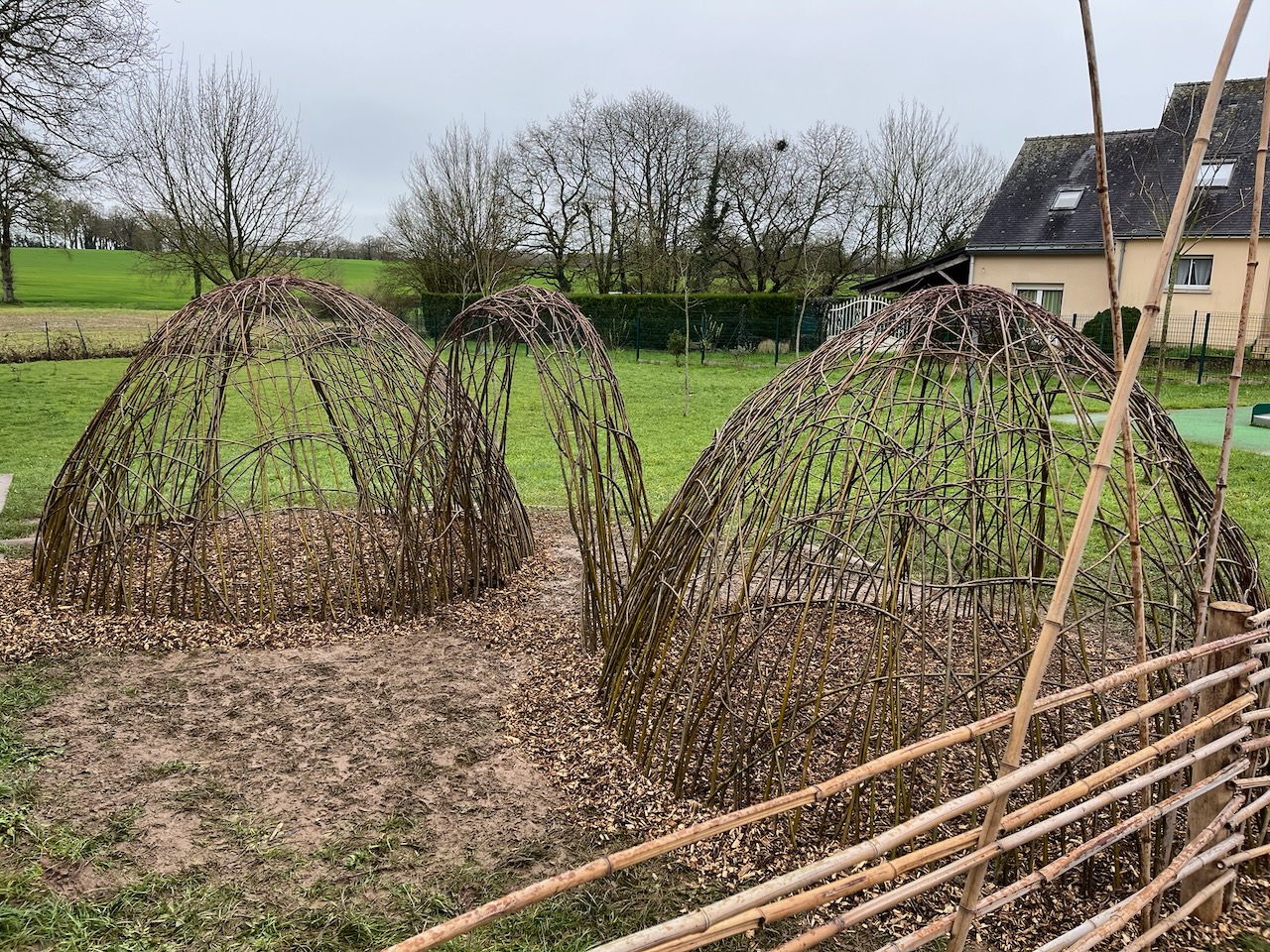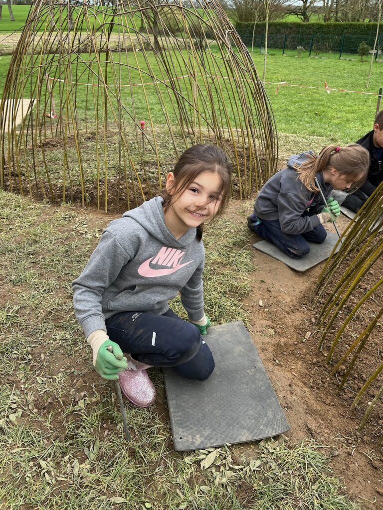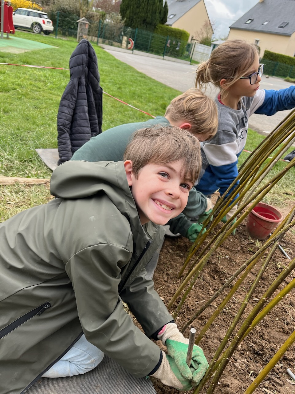 Ce projet a mobilisé les quatre classes de l’école autour d’un objectif commun : créer ensemble un espace naturel, durable et évolutif, au cœur de la cour de récréation. Encadrés par Caroline Chomy, les élèves ont découvert une technique particulière consistant à tresser des brins d’osier encore vivants. Au fil des jours, ils ont ainsi donné forme à deux véritables cabanes végétales.