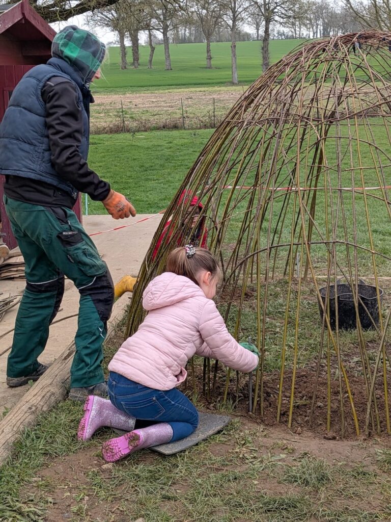 Car cette cabane est bien vivante : dans les mois à venir, les branches d’osier vont bourgeonner, se couvrir de feuilles et transformer progressivement la structure en un véritable refuge végétal.