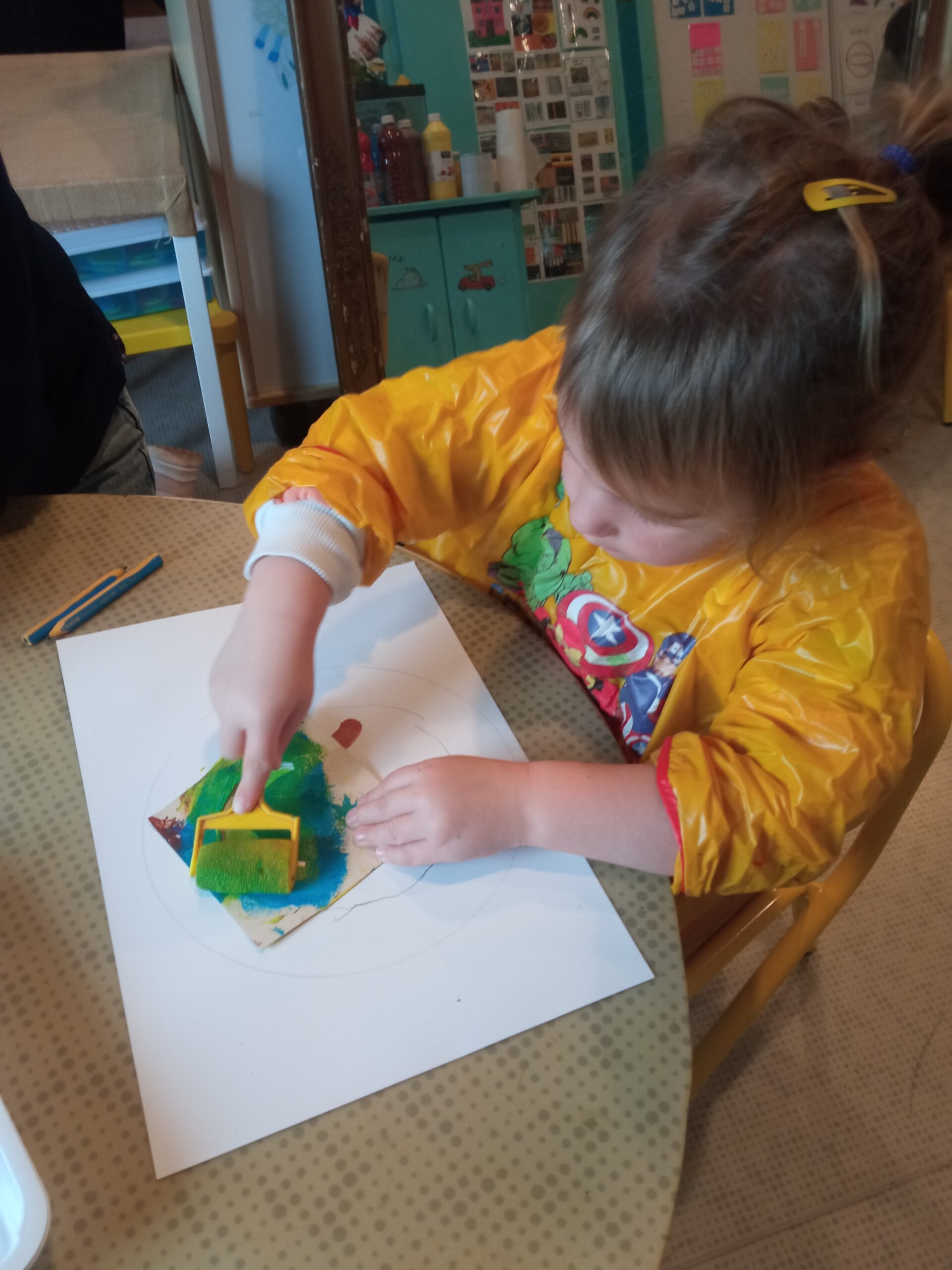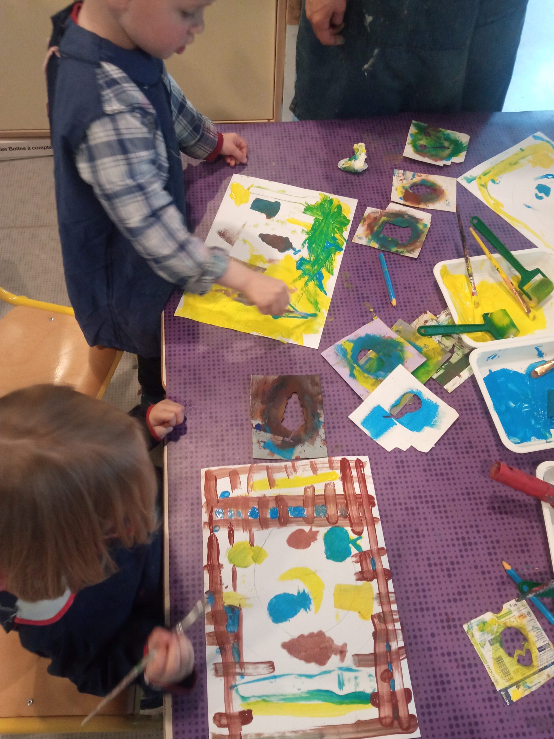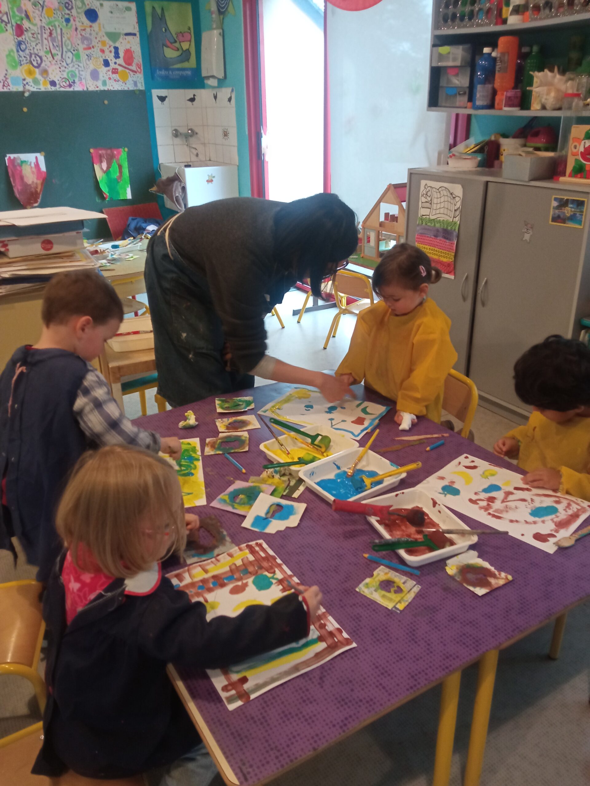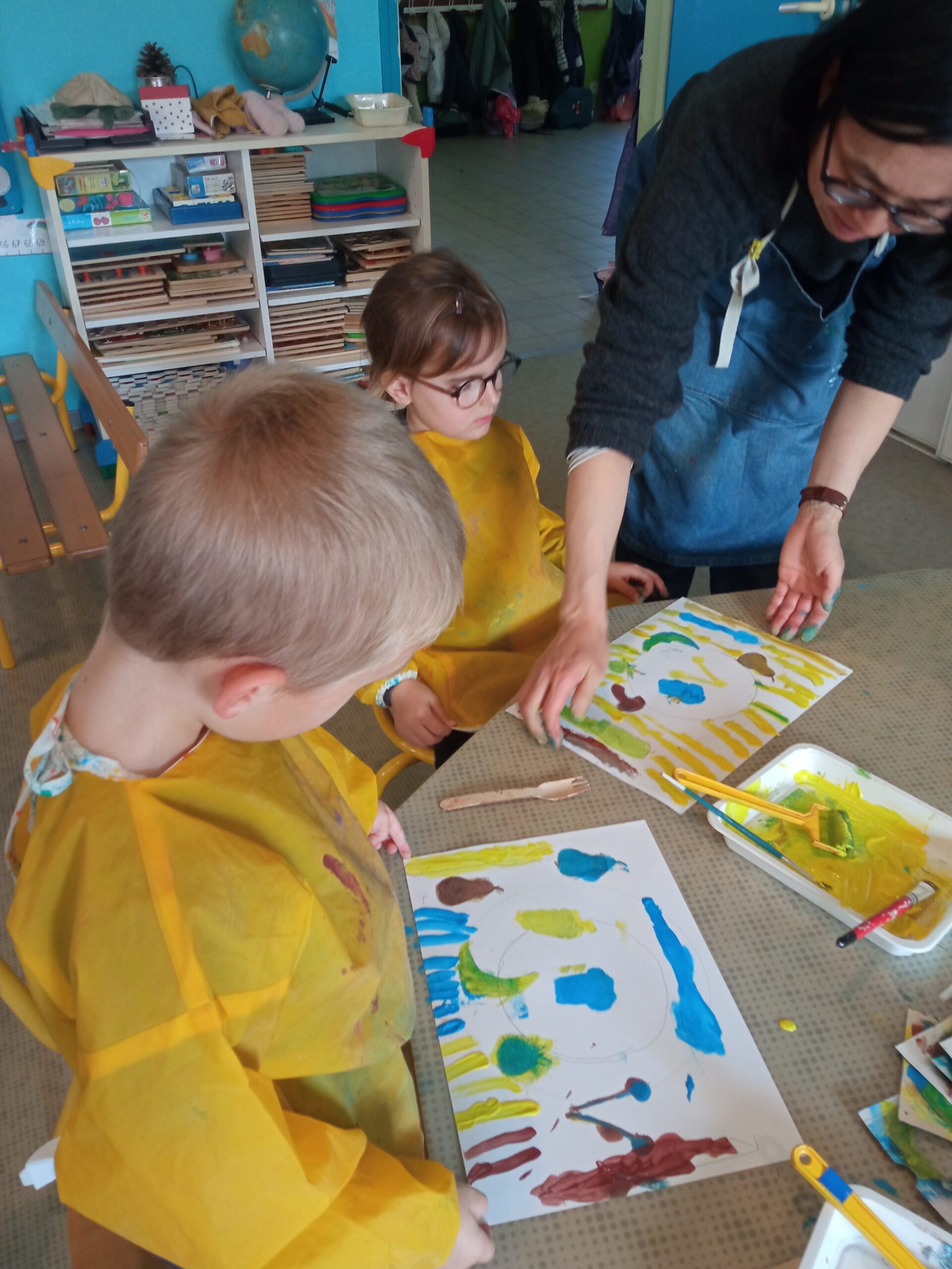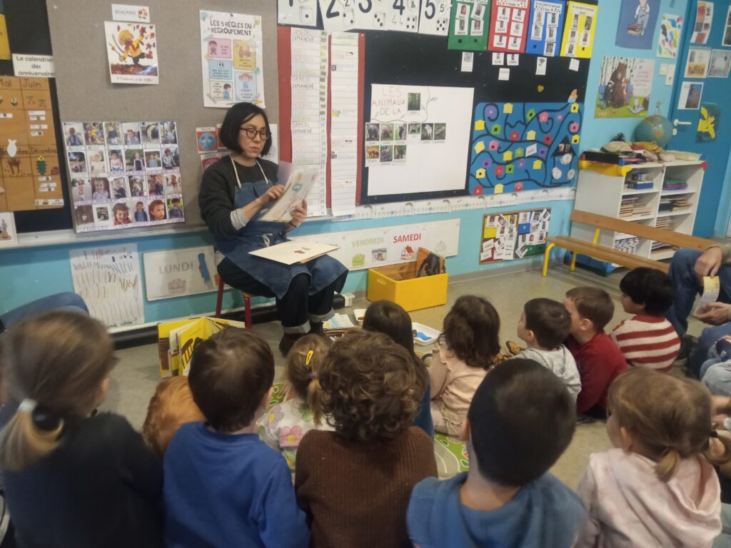 Notre classe a eu la chance de rencontrer l’auteure de notre album de la semaine » Ce matin » : Junko Nakamura. « Elle nous a présenté son travail et expliqué comment elle faisait. Ensuite, nous avons préparé notre assiette de petit déjeuner comme dans le livre. Avec les mêmes couleurs : jaune, bleu et marron. On commence par tracer notre assiette, puis à peindre les fruits avec un pochoir, tracer les couverts et les peindre et enfin, nous avons décoré la nappe. »